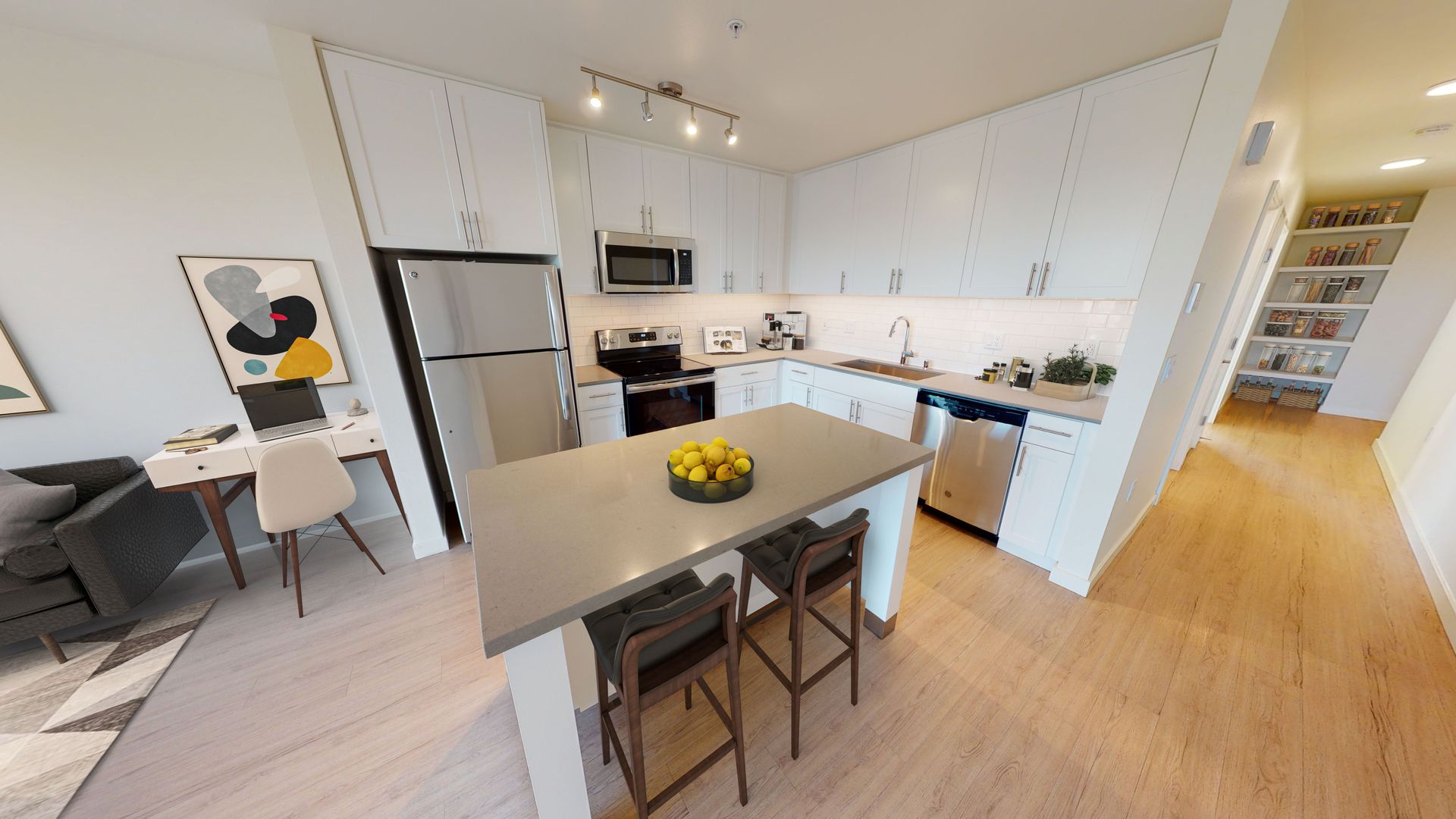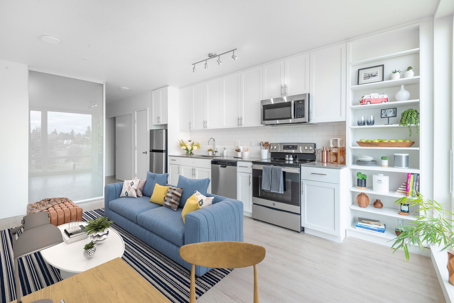 This fabulous studio has a formal entry with floor-to-ceiling windows throughout the home to maximize natural light. The kitchen features Quartz countertops with an under-mount sink, subway tile backsplash, pantry, and adjacent shelving, stainless steel appliances, glass cooktop, and under-mount cabinet lighting with a dimmer to set any mood. All of our homes have a full-size washer and dryer and are equipped with air conditioning. The living room has access to your own outdoor patio!